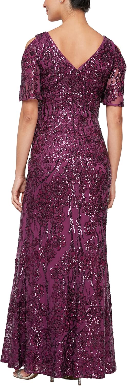 Elevate your formal wardrobe with the Alex Evenings Women's Long Sequin Dress, a stunning piece that combines elegance and contemporary style. This floor-length gown features an all-over stretch sequin fabrication that ensures both comfort and a show-stopping sparkle. The V-neckline gracefully elongates your silhouette, while the cold shoulder flutter sleeves add a romantic and feminine touch to the overall design. Perfect for Mother of the Bride, wedding guests, or any formal occasion, this A-line dress flatters various body types and exudes timeless sophistication. The sequin embellishment catches the light beautifully, making you the center of attention at any event. With its versatile style and impeccable craftsmanship, this best-selling dress is an investment piece that you'll cherish for years to come. Whether you're attending a gala, a black-tie wedding, or a cocktail party, the Alex Evenings Long Sequin Dress is the ultimate choice for those seeking both comfort and glamour in their evening wear.